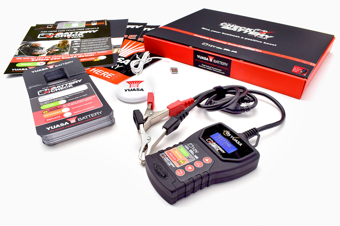 Yuasa battery tester, point-of-sale material, 100 test result mirror hangers - all neatly contained in one box. In the manual you find all the benefits for customer service and sales and also the results of our workshop field tests.